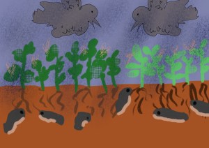 [The continuing saga of the ‘piranha’ grubs.] We were bemoaning our purina bugs to X after church, and she said they are having a terrible time with them. According to her they always move north and each moth produces 10,000 eggs. If the farmer to your south doesn’t do anything one year you have a time the next. Their neighbour didn’t care last year! Their son dug a hole for a tree for her, and out of a square foot (compared to the normal disaster rate of 4 grubs) he found 39! I’m glad we don’t lie north of them! – though they have been trying to combat them and have had a helicopter spraying their fields.